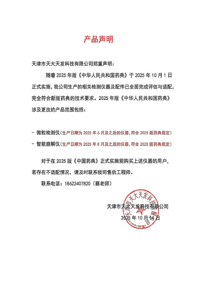 聲 明鑒于2025版《中國藥典》的更新,為保障天大天發(fā)忠實(shí)用戶的切身利益,凡在2025年之前購置我公司設(shè)備的客戶,若您的設(shè)備未能滿足新版藥典的要求,我們將提供升級服務(wù)。涉及產(chǎn)品:微粒檢測儀:GWJ-1···...
